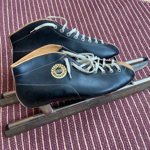 Godt brukt bl.a Ballangrud skøyter, 1 par svenske i strl 43. 2 par i strl 45 og 1 par i strl 46. 3 par med beskyttere av eggen. (Kalosjer). Kr. 800 eller 200 kr pr par!