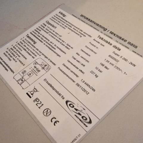OSO varmtvannsbereder med volum på 200 liter og effekt på 1,95 kW. Berederen er beregnet for elektrisk tilkobling og er merket med IP21 og CE. Etiketten viser tekniske data, inkludert vekt og elektriske spesifikasjoner, samt informasjon om tømming og sikker bruk. Egnet som varmtvannsbereder i bolig eller tilsvarende installasjon der det er behov for lagring av varmt tappevann.