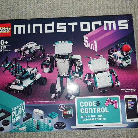 LEGO Mindstorms byggesett robot og kjøretøy. Settet består av LEGO-klosser og elektroniske komponenter for å bygge programmerbare roboter og kjøretøy. Inneholder hovedenhet, motorer og sensorer som kan styres via app.