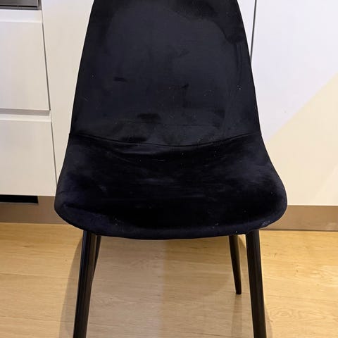 4 stoler til spisestue i Blåsvart Velourtrekk. Pent brukt og klar for et nytt sted å bo!