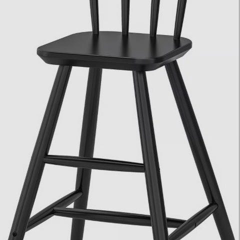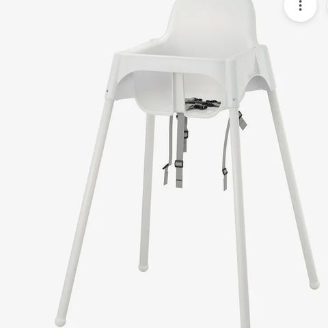 IKEA høy barnestol i hvit farge. Barnestolen har sete med ryggstøtte og sikkerhetsbelte. Utført med fire rette ben som gir stabilitet. Egnet for små barn som skal sitte ved bordet under måltider eller aktiviteter. Enkel, funksjonell utforming som er lett å plassere ved spisebordet.