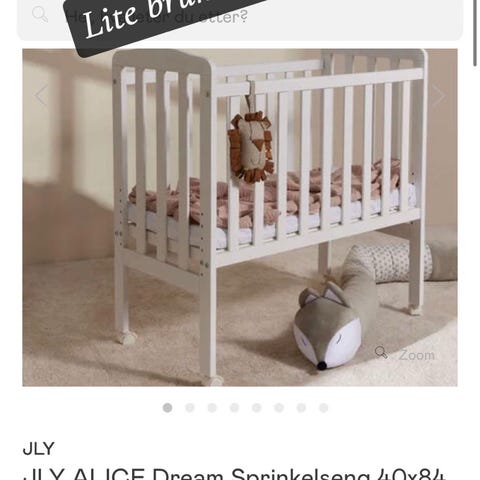 Mangler ei side og selges derfor billig. Har brukt den som «bedsidecrib» inntil vegg og seng, då har det gått fint uten den eine «veggen»😊