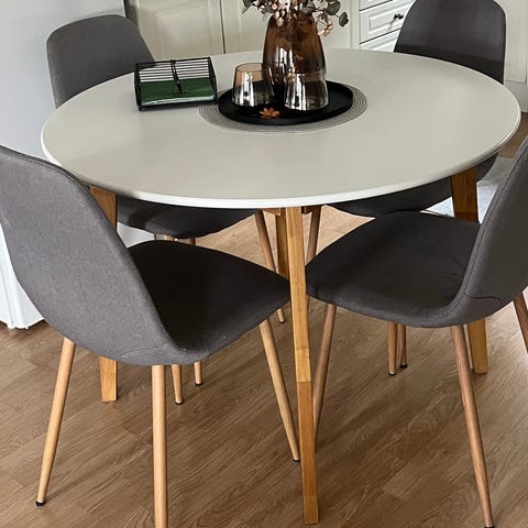 Spisegruppe fra Jysk - bord med 4 stoler. Pent brukt, noen flekker på stolene men med en rens så tror jeg de vil bli borte. Er ikke veldig merkbart da stolene er mørke i fargen. Selges 2000kr.