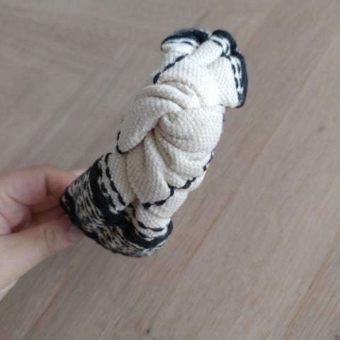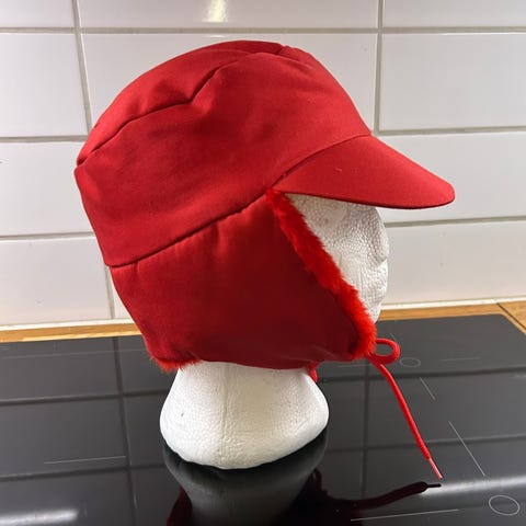 Hårbøyle med påsydde ører og stor sløyfe. Bøylen er trukket i rødt stoff med hvite prikker, og ørene er i lys brunt stoff. Passer som tilbehør til utkledning, temafester eller kostymebruk. Stofftrekket gir en myk og behagelig kant mot hodet. Fra kutoppen