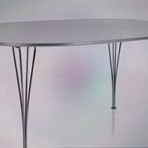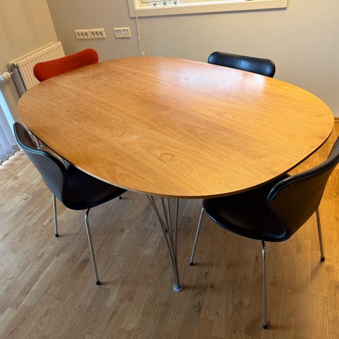 Fritz Hansen superellipse spisebord fra 2010. Bordplaten er i tre med synlig trestruktur, og bordet står på slanke metallben. Passer som spisebord eller møtebord i kjøkken, stue eller kontor.