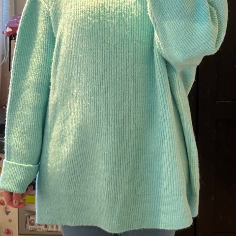Turkis genser med turtleneck og balloon sleeves.