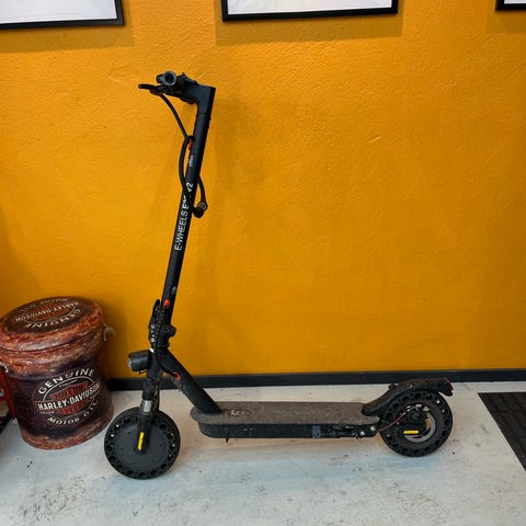 E-Wheels E2S V2 elektrisk sparkesykkel i svart farge. Modellen har sammenleggbar ramme som gjør den enkel å frakte og lagre. Utstyrt med massive hjul og elektrisk motor plassert i forhjulet. Styrestangen har håndtak, bremsespak og gasshendel, samt kabelføring langs rammen. Egnet for bruk på asfalt og jevne underlag som et praktisk framkomstmiddel over korte og mellomlange distanser. Passer for én stående fører av gangen. Dekkene på El-sparkesykkelen er punkteringsfrie og oppbevaringsveske til å ha lader i kan følge med.