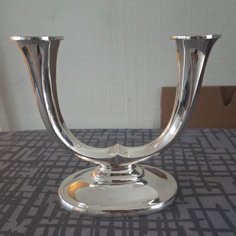 2 sølv kandelabere 2-armet, 830 S, nostalgiske! 17 cm høy, 33 cm bred. kr 7995 ny pr stk. Flott på et dekket bord.