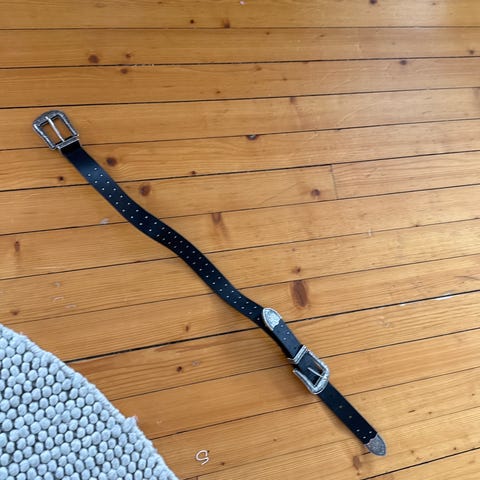 Selger et svart unisex belte på 95 cm. Beltet har små sølvspenner og detaljer som gir et stilrent og tøft uttrykk. Kan enkelt strammes og justeres etter behov, så det sitter godt i livet.