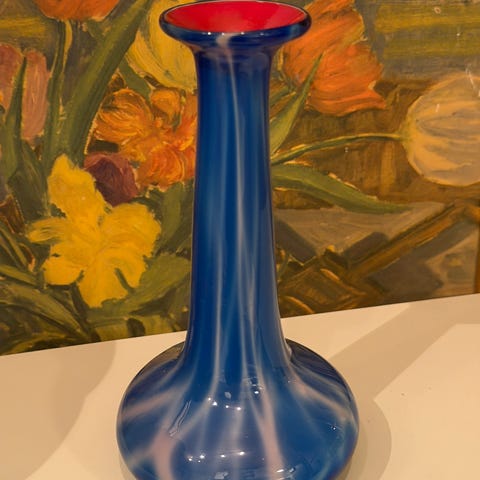 Håndblåst glassvase eller kunstglass med et rosa lag og fargerike inneslutninger. Trolig munnblåst Anna von Lipa Confetti. H 11 cm, Ø 14,5 cm