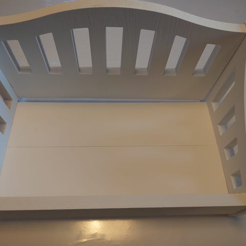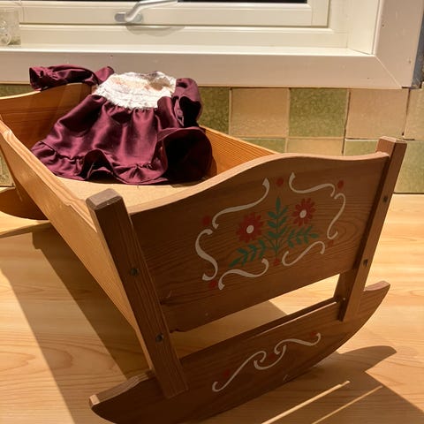 Dukkeseng. Hjemmesnekret. Solid kvalitet. Malt treverk. Har litt bruksmerker, men er i god stand.