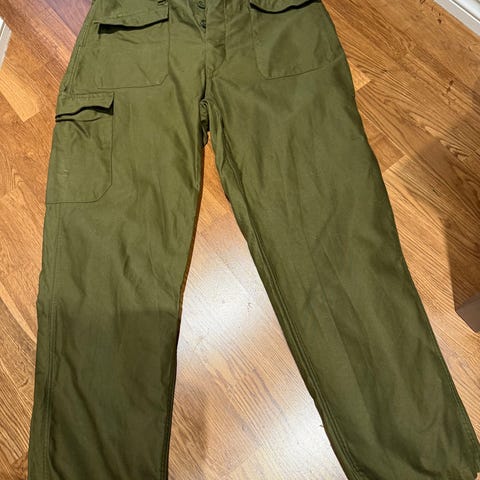 Meget sjelden Forsvaret feltbukse i norsk kamuflasjemønster. Buksen har justerbar livvidde med knapper og stropper, samt beltehemper. Flere lommer på sidene og bak gir praktisk oppbevaringsplass. Størrelse er merket 50–52 med lengdeangivelse 7580/8095 på innvendig merkelapp. Egnet som arbeidsbukse eller friluftsbukse. Vaskes på 60 grader ifølge vaskeanvisning på lappen.