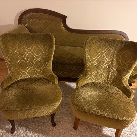 Store tunge furumøbler. Se bildet av salonggruppen i en annet stoff. Putene er noe slitt, se bildet!