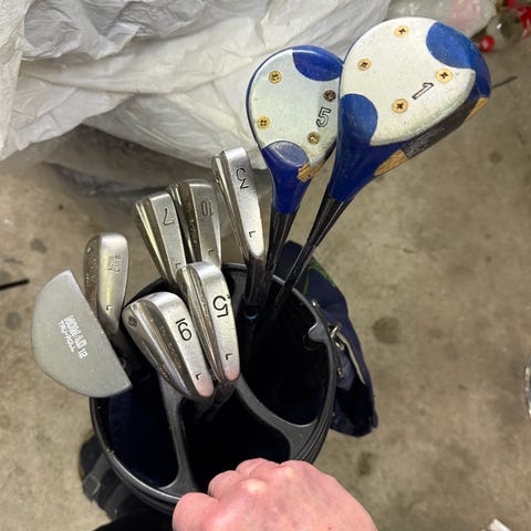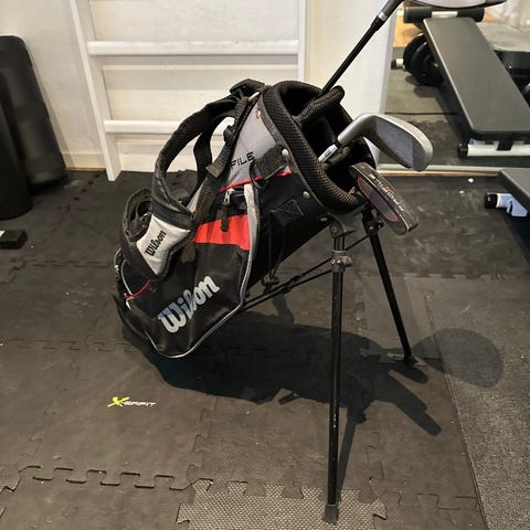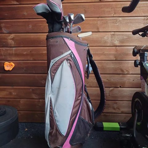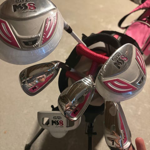 Callaway XJ junior golfsett med bærebag i rosa og svart. Sett med flere køller, inkludert wood, jern og putter, tilpasset juniorer. Golfbagen har bærestropp, flere lommer for oppbevaring av baller og tilbehør, samt stativbein for å kunne stå stødig på bakken. Fargekombinasjon rosa, svart og hvit med matchende detaljer på køllehodene og skaftene. Putter, sw, 9 hybrid 5, wood 3, og driver. Passer til 119-134cm