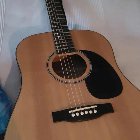 Dreadnought med solid ceder top, fin til fingerspill,lav strenghøyde. Selges for plassmangel. Må hentes på Frekhaug litt utenfor bergen. Kjøpte den rett før jul så er nesten helt ny