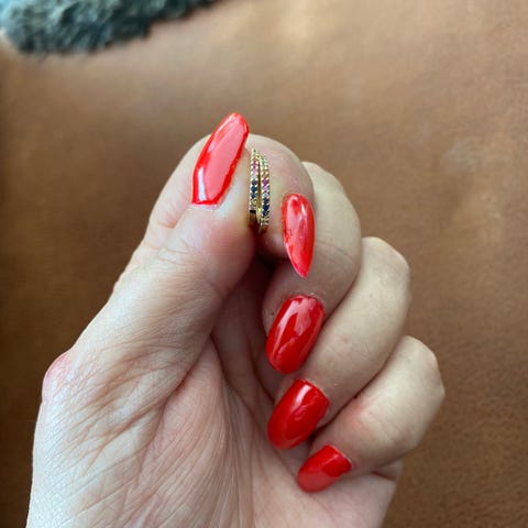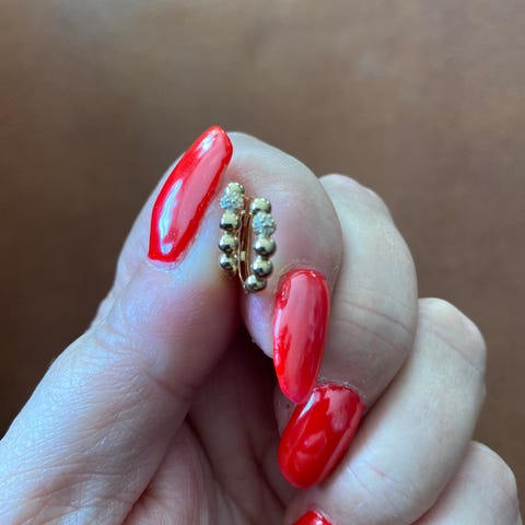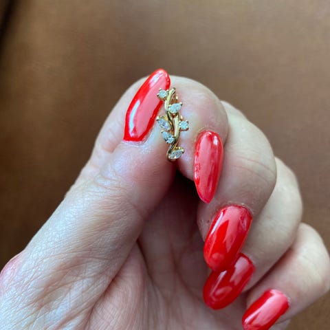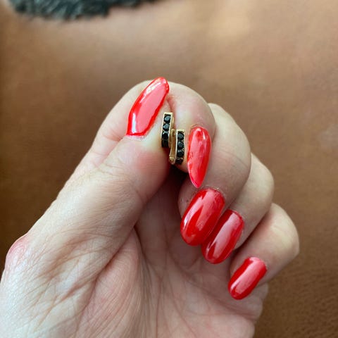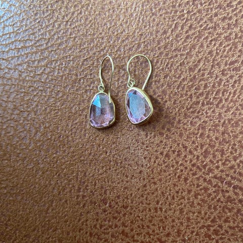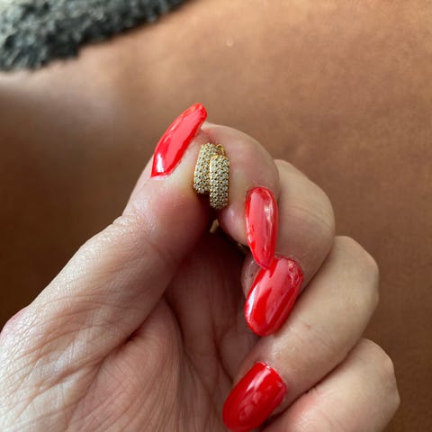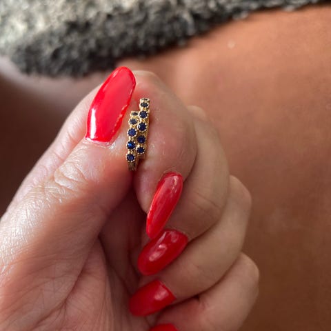 øredobb i ringform for dame. Smykket er laget i gull 9k med små klare krystaller plassert langs den ene siden av ringen. Passer til hull i øret og kan brukes alene eller sammen med andre øredobber. Størrelsen fremgår av bildet med målebånd for omtrentlig diameter.