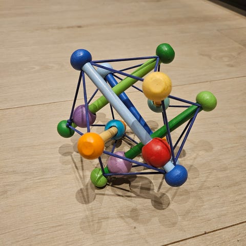 Treleke/aktivitetsleke i flerfarget design. Egnet som motorikk- og gripe-leke for små barn.