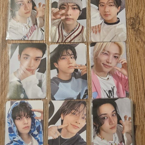 Stray Kids tincase fra Dominate Celebrate merch selges. Wolfchan har vært pakket opp for å illustrere at det er kort nedi hver eske