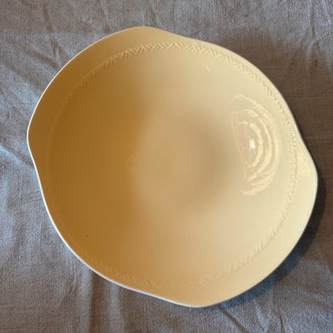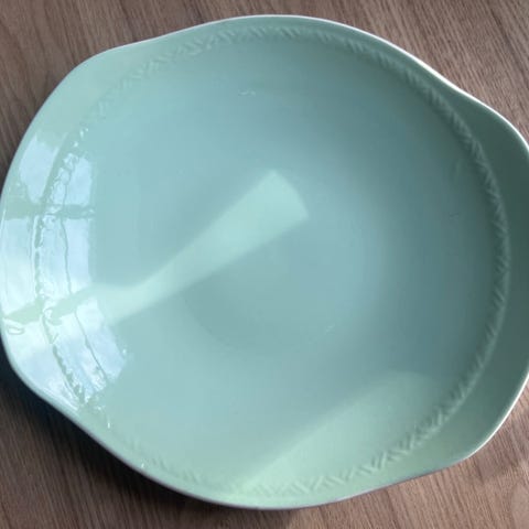 Gammelt, helt og fint fat i ensfarget grønt med mønster rundt kanten. Kan det være Sissel? Ca 23x30