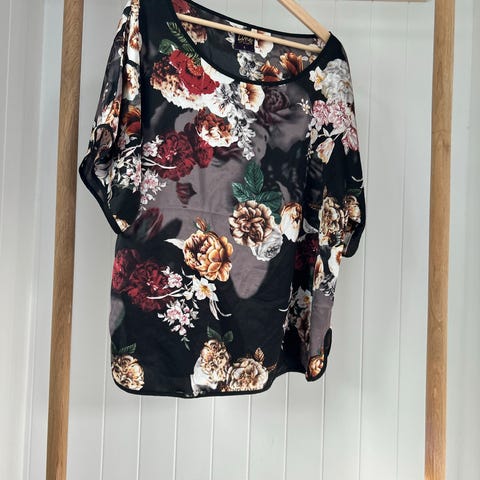 Haust bluse for dame i størrelse 38. Blusen har svart bunnfarge med flerfarget blomstermønster i hovedsak røde og grønne toner. Modellen har lange ermer med lett volum.