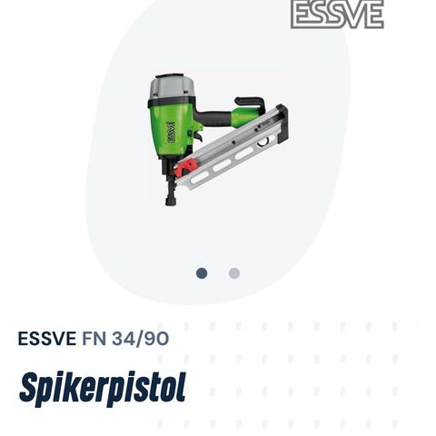 Essve spikerpistol levert i plastkoffert. Spikerpistolen er beregnet for bruk til trearbeid der det er behov for rask og presis innskyting av spiker. Kofferten har formtilpassede rom for verktøyet og tilbehør, som gjør det enkelt å oppbevare og transportere spikerpistolen mellom arbeidssteder.
