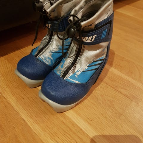 Alpina Frost langrennsko/ skisko for barn i blå farge. Str 34. Skoene har glidelås foran og borrelåsrem over vristen for bedre støtte og passform. Overdelen er i syntetisk materiale med isolerende innerfôr.