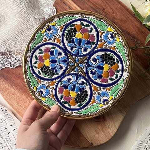 Dekorativ og fargerik veggtallerken fra Spania, rikt utsmykket med blomster og geometriske mønstre i blått, rødt, grønt og gult, innrammet av gullfarget kant. Tallerkenen er merket på baksiden med «Pintado a mano en esmalte y oro de ley, Artecer – España, Esther», som bekrefter at den er håndmalt med emalje og ekte gull. Et flott eksempel på tradisjonell spansk keramikk, perfekt som blikkfang på vegg i stue, kjøkken eller hytte. Et flott og livlig innslag i interiøret. 🌸 Se bilder for mål. 🌸