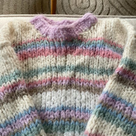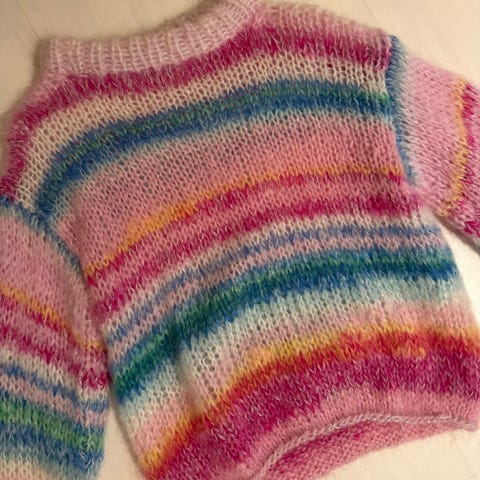 Design: En fargerik "rainbow"-genser med horisontale striper i ulike nyanser av blått, rosa, grønt og brunt.