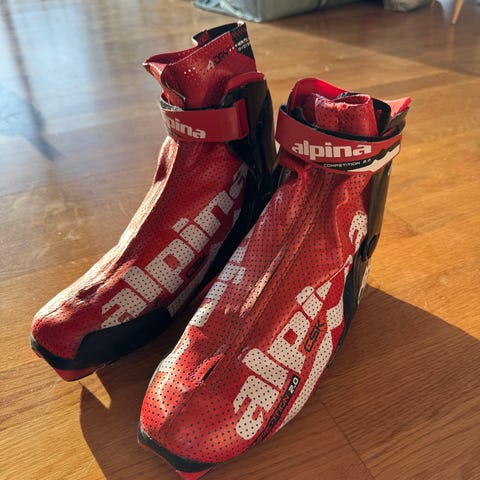 Alpina langrennsstøvler i rødt syntetisk materiale. Støvlene har høy ankelstøtte med plastforsterkning bak og borrelåsreim øverst for bedre stabilitet. Glidelås foran beskytter lissene og gir en mer lukket og isolert sko. Brukt, to små merker på tuppen av skoen, mye sko igjen! 🎿