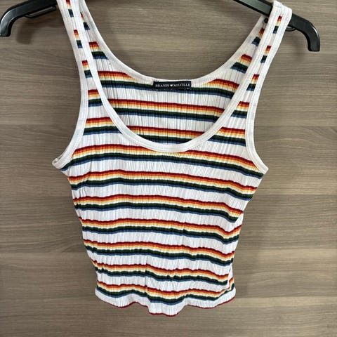 Brandy Melville singlet i bomull, one size. Topp med tynne stropper og blondekant øverst. Hvit bunnfarge med rødt hjerte-mønster. Mykt bomullsstoff som passer til hverdagsbruk, under genser eller som lett sommertopp.