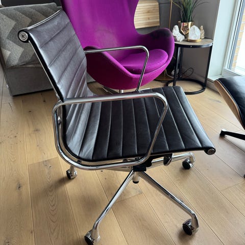 To originale Eames-stoler i sort skinn kjøpt nye hos Marnburg i Stavanger. Stolene kan vippes (med låsefunksjon) og snurres, og de har høyderegulering (+/- 12 cm). Pris er pr stk.