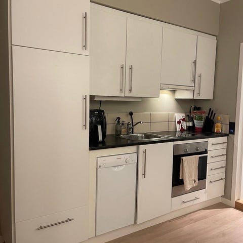 Løsningen passer til et standard kjøkken og kan tilpasses ved omplassering av skap og skuffer etter behov. Egner seg for gjenbruk i kjøkken, hybel eller som oppbevaringsløsning i bod eller verksted. Eventuelle hvitevarer følger ikke nødvendigvis med og må avklares med selger.
