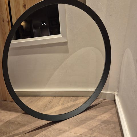 IKEA rundt speil med hvit ramme. Speilet har enkel, rund form som passer i ulike rom som gang, soverom eller stue. Rammen er i lys, nøytral farge som gjør det lett å kombinere med annet interiør. Det kan plasseres på hylle eller kommode, eller henges opp på vegg dersom oppheng monteres. På detaljbilde vises en liten markering i speilflaten nær kanten.