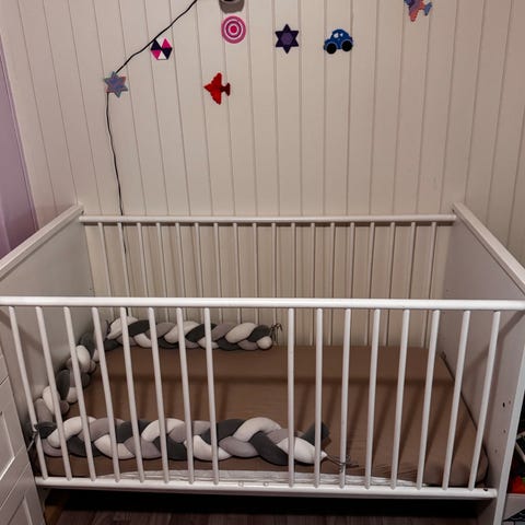 IKEA sprinkelseng med oppbevaringsskuffer under. Sengen har klassiske sprosser på sidene og hel gavl i begge ender. Fargen er lys grå. Under sengen er det tre skuffer som gir ekstra oppbevaringsplass til for eksempel sengetøy eller babyutstyr. Egnet for små barn i sprinkelsengalder. Madrass kan følge med. Bunn kan heves