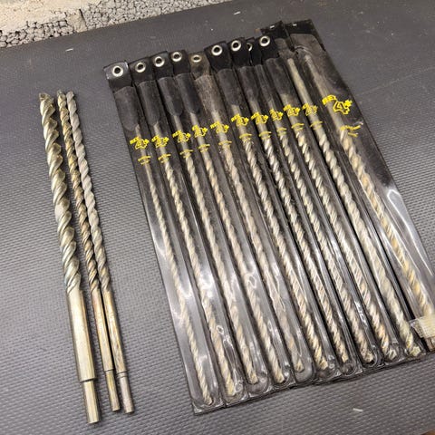 Selger tre lange betongbor for SDS-Plus. Dimensjoner ca. 16 mm, 24 mm og 25 mm, alle rundt 500 mm lengde (se bilder for nøyaktig merking). Brukt, med normale bruksmerker og noe overflaterust, men fremstår rette og uten synlige skader på skjær.