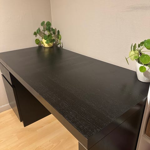 Bordet er solid og praktisk, med skap for oppbevaring. Den ene spikeren i skapet er litt løs, men den kan enkelt skrus fast igjen og påvirker ikke bruken.