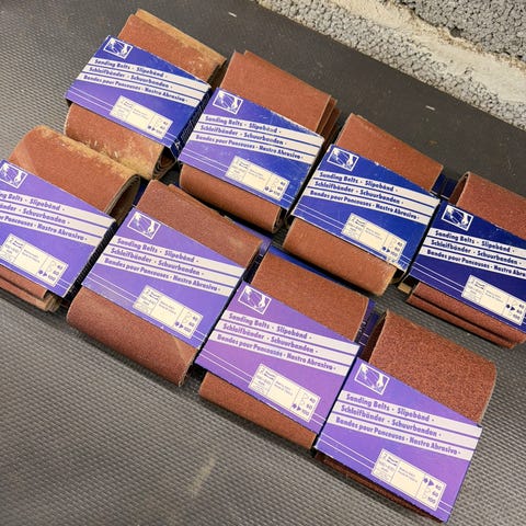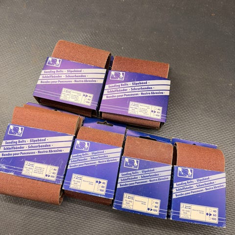 Selger fire pakker slipebånd fra A-S Santo (Drammen – Norway). Dimensjon 75 x 533 mm. Korning 60, 80, 100 og 120. 10 stk i hver eske. Passer blant annet Bosch 0270, Hitachi SB-75, Makita 9900B, Ryobi B 7075, Skil 594/595 og AEG HBS E 75S (se etikett på bilde).
