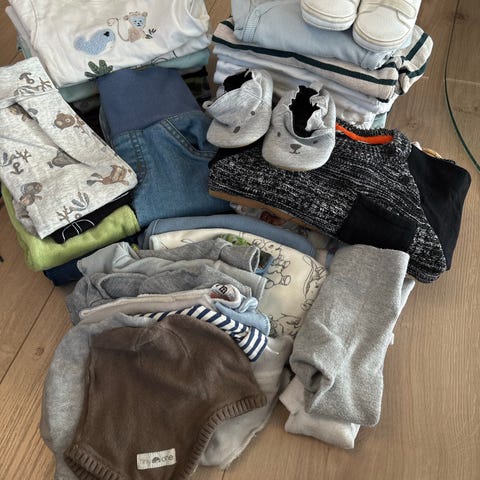 Selger klespakke i str. 68 (4-6 mnd). Pent brukt. Totalt 20 plagg og inneholder: