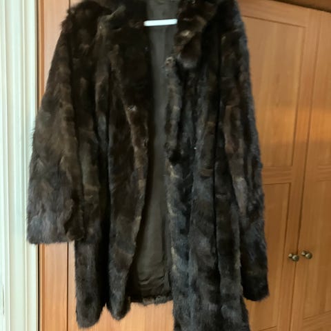 Selger en arvet svart lang pels med klassisk snitt og kraftfullt uttrykk.