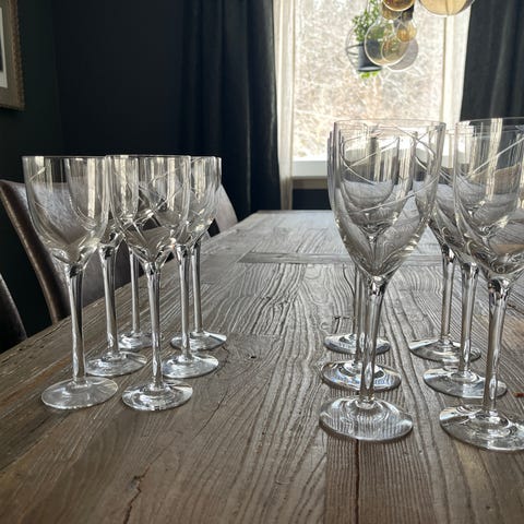 11 28 cl vinglass, 7 20 cl vinglass, 4 ølglass og 1 karaffel. Alt er ubrukt eller minimalt brukt. Uten bobler eller feil.
