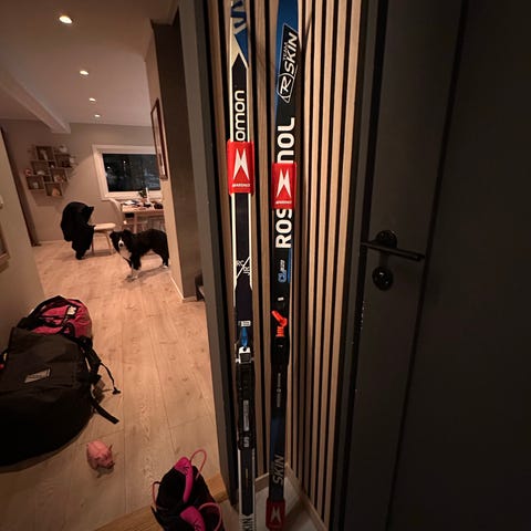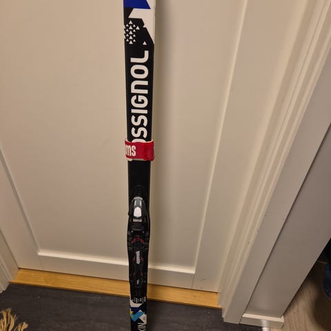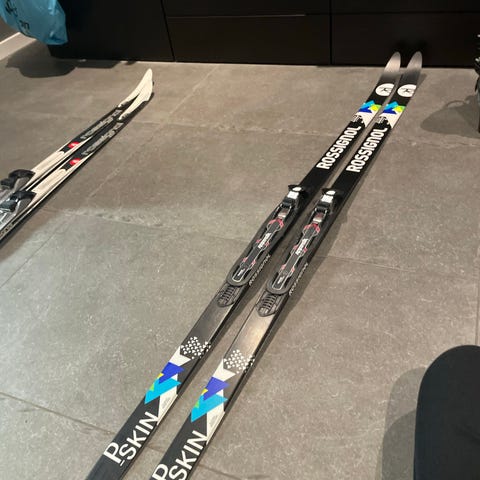 Rossignol R-Skin langrennski med integrerte feller i svart og rødt. Skiene har fell under festesonen for klassisk langrenn, som gir feste uten bruk av festevoks. Passer til tur- og treningsbruk i preparerte løyper. På bildene følger det også med et par langrennsstaver på 115 cm lengde, med håndtak og reimer. Skiene har bindingssystem for klassisk langrenn (se bilder for detaljert type).