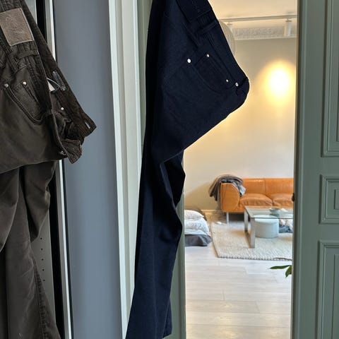 Buksen er nesten ubrukt, fremstår som svært pen, med minimal vaskepåvirkning og dyp, mørk indigotone. Den er lagt opp av skredder og tilpasset en person på ca 170 til 175 cm høyde, noe som gir en presis og ferdig lengde for deg i dette høydeintervallet. Dette er et kvalitetsplagg i øvre segment som blir stadig bedre i bruk, og et klart mer interessant valg enn ordinære denimmodeller.