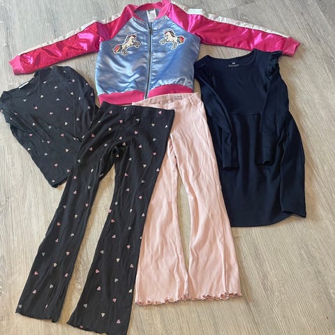 8 bukser, 6 tshirts, 17 gensere, 4 kjoler og ett skjørt. Merker fra Lindex, KappAhl, USA, HM og The New, Zara òg Pompdelux Mye er ubrukt, dette er ett kupp. Se detaljbilder