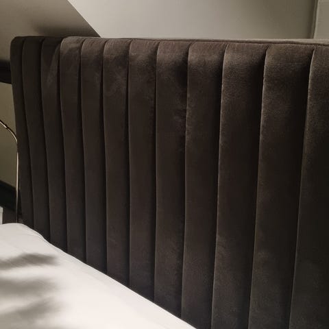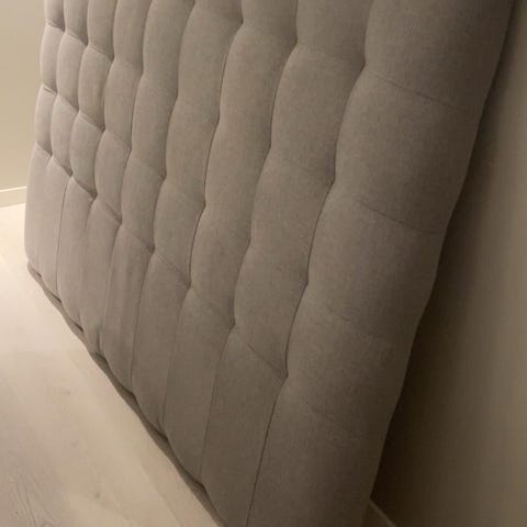 Sengegavl i grå tekstil. Sengegavlen har en polstret og vattert front i et rutenettmønster. Passer til 180 seng.