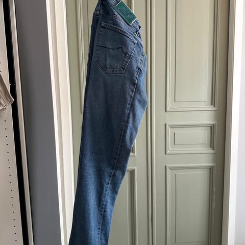 Selger en svært pen Tramarossa i modellen Leonardo, størrelse 32, i ren hvit denim. Dette er den klassiske Leonardo passformen med middels livhøyde og en slank, elegant silhuett som sitter rent over hofte og lår og faller naturlig ned mot ankelen uten å bli for smal. En balansert og sofistikert passform som fungerer like godt til loafers og skjorte som mer avslappet styling.