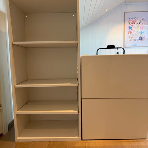 Romslig seksjon satt sammen av BESTÅ-moduler fra IKEA. Her kan det oppbevares MYE. Seksjonen består totalt av 7 deler med både hyller, skuffer og skapdører som er både hvite og i glass. De to skapdørene med sort/hvitt blomstermønster er av glass og mønsteret er et stoff bak glasset som lett kan fjernes. Ønsker man flere/eller andre dører kan man supplere med nye fra IKEA. Seksjonen er noen år og den hvite fargen har nok gulnet noe, men ellers er den i god stand. Selges pga flytting.