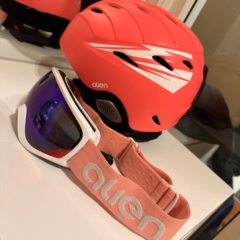 Passer til alpint og snowboard, med kombinasjon av hjelm og briller for bruk i bakken.