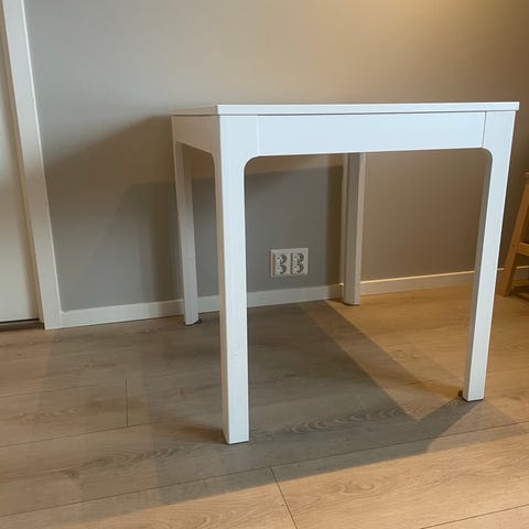 Et fint spisebord med forlengelse. Vi flyttet på delen som brukes til å forlenge bordet til siden (bilde nr. 6). Kan flyttes tilbake sånt som det var før (bilde nr. 2). Med den blir bordet langt 190 cm.