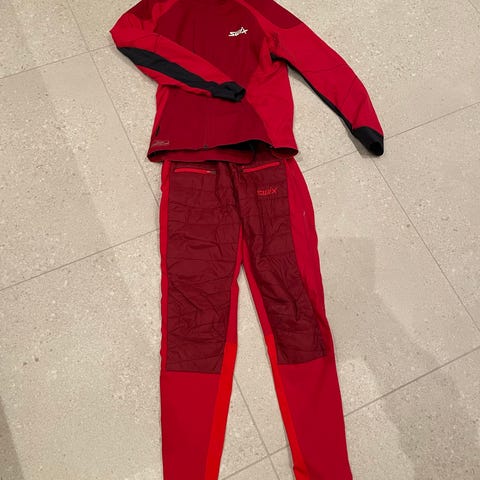 Swix yttertøysett for dame i størrelse L. Sett bestående av jakke med hette og matchende bukse. Plaggene er laget i polyester flerfarget design med burgunder, hvite og røde felt. Jakken har glidelås i front, sidelommer med glidelås og elastiske avslutninger. Buksen har elastisk linning og glidelås nederst ved bena. Egnet som yttertøy til langrenn ski.
