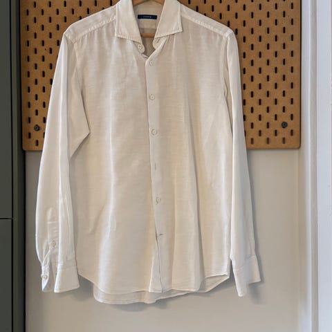 Skjorten er laget i en luftig bomullsmesh som kan minne om en glattere versjon av stoffet Sunspel bruker i Riviera-skjortene sine.